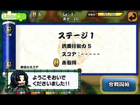 操作はシンプルで攻撃する敵をタッチして弓を射つ。援軍の兵士やくのいちを召喚する多彩な計略(スキル)を駆使して激戦を戦く流れ。